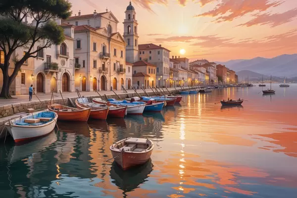 Plakatas Italijos pakrantės miestelis saulėlydžio metu su spalvingais pastatais, išsidėsčiusiais pakrantėje ir valtimis plaukiojančiais ramiuose vandenyse Ne f40150