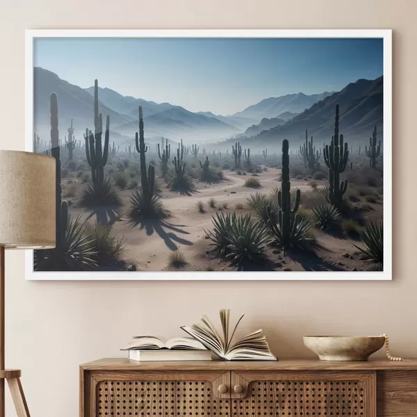 Plakatas Dykumos peizažas su aukštais kaktusais ir jukų augalais pirmame plane, apsuptas miglotų kalnų Ne f40153