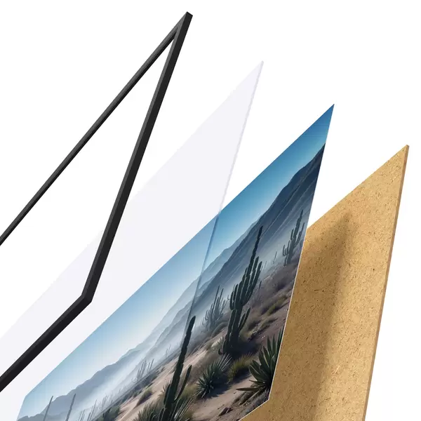 Plakatą sudaro rėmas, pleksiklas, atspausdintas vaizdas ir medžio drožlių plokštės pagrindas. Plakatą galima iš karto pakabinti ant sienos dėl kitoje pusėje esančių laikiklių.