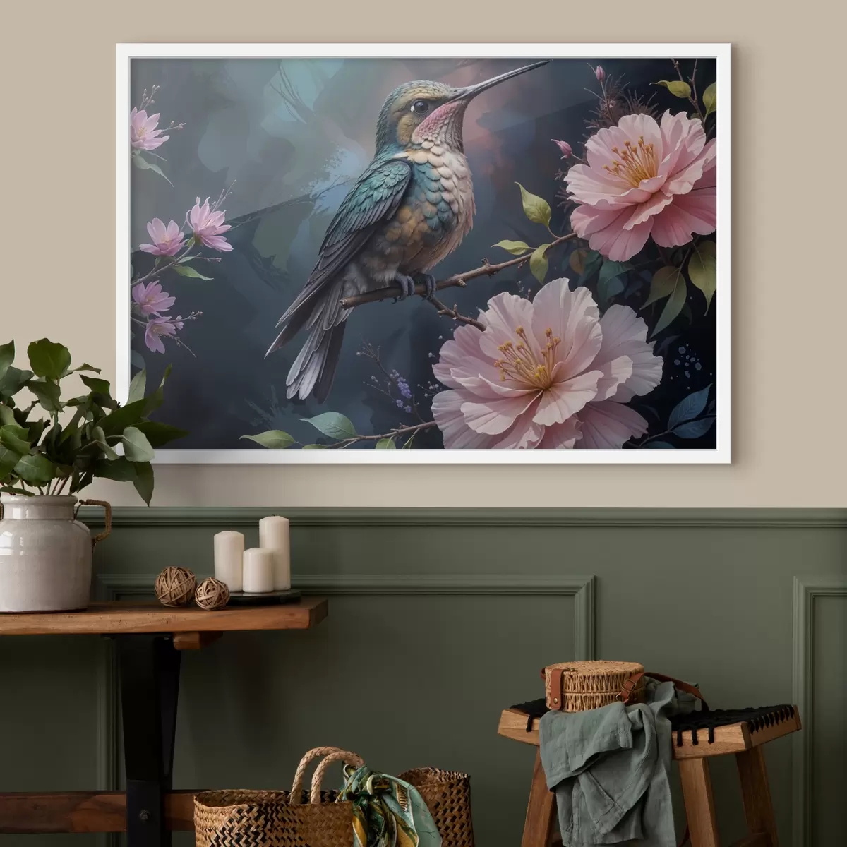 Plakatas Spalvingas kolibris, tupintis ant šakos su ryškiomis rožinėmis gėlėmis fone f40155