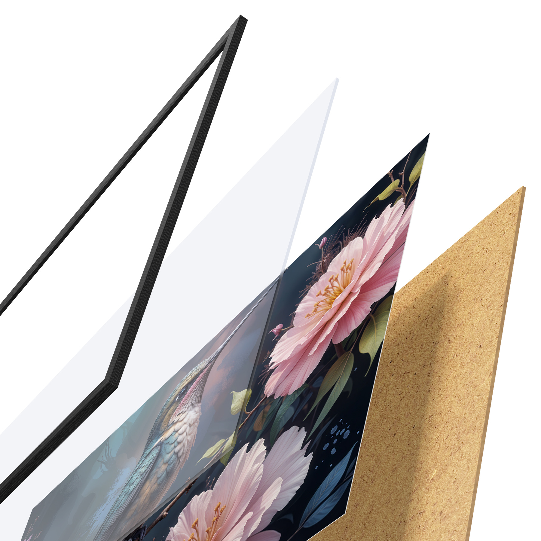 Plakatą sudaro rėmas, pleksiklas, atspausdintas vaizdas ir medžio drožlių plokštės pagrindas. Plakatą galima iš karto pakabinti ant sienos dėl kitoje pusėje esančių laikiklių.