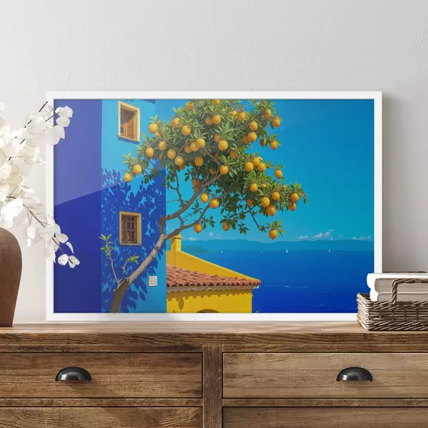Plakatas Apelsinmedis su prinokusiais vaisiais auga ant pastato su mėlyna siena ir čerpiniu stogu su vaizdu į vandenyną f40159