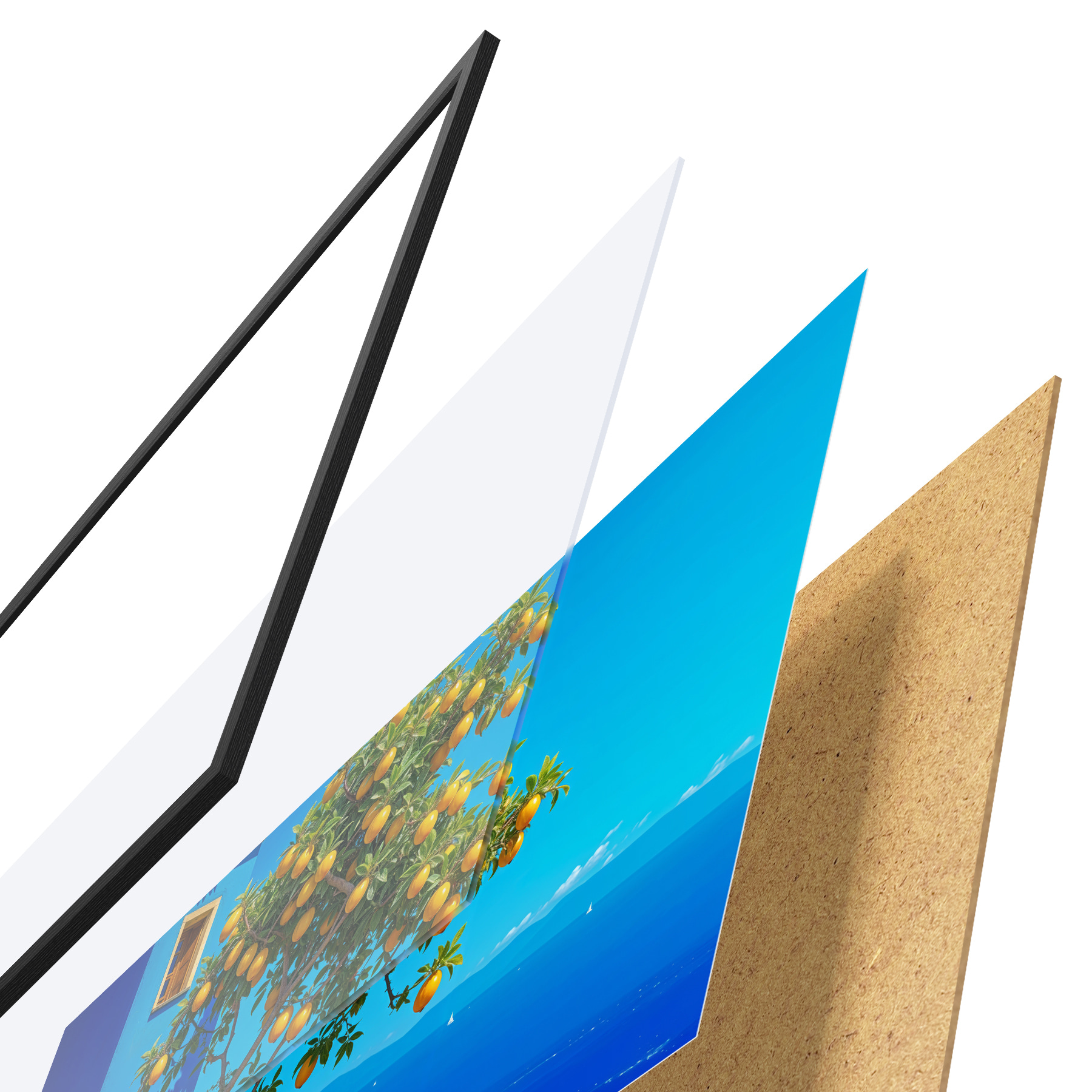 Plakatą sudaro rėmas, pleksiklas, atspausdintas vaizdas ir medžio drožlių plokštės pagrindas. Plakatą galima iš karto pakabinti ant sienos dėl kitoje pusėje esančių laikiklių.