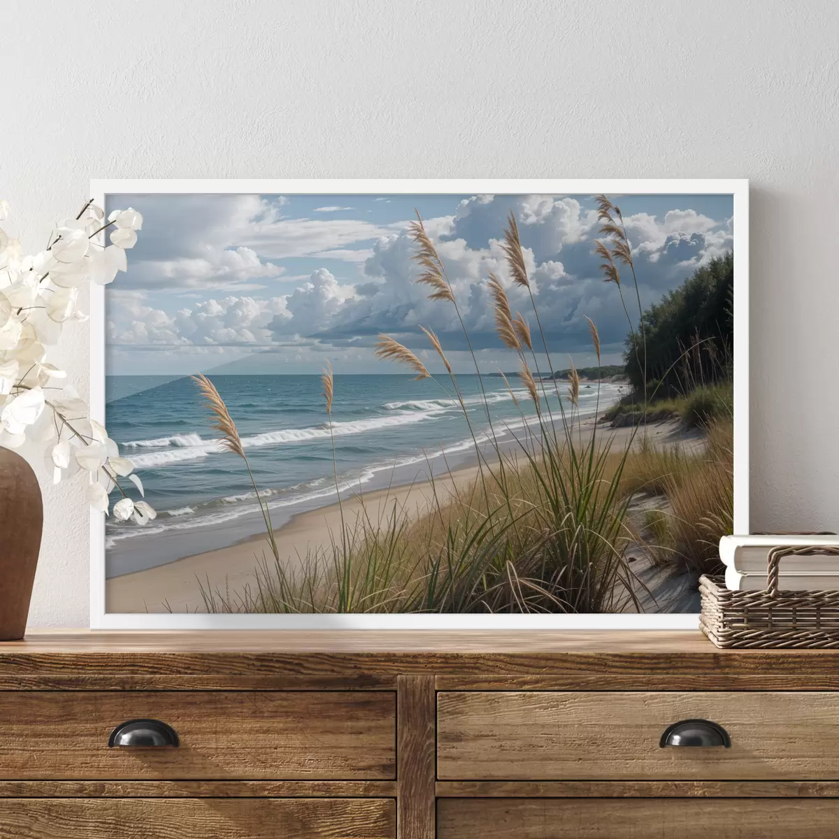 Plakatas Vaizdingas paplūdimys su aukšta žole, siūbuojančia vėjyje, su vaizdu į vandenyną su bangomis ir debesuotu dangumi Ne f40161