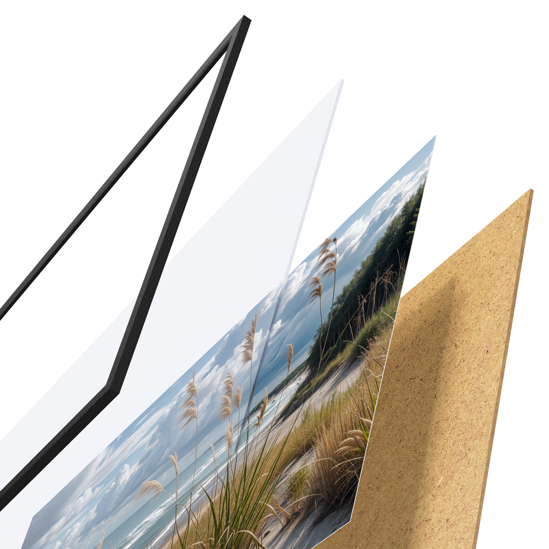Plakatą sudaro rėmas, pleksiklas, atspausdintas vaizdas ir medžio drožlių plokštės pagrindas. Plakatą galima iš karto pakabinti ant sienos dėl kitoje pusėje esančių laikiklių.