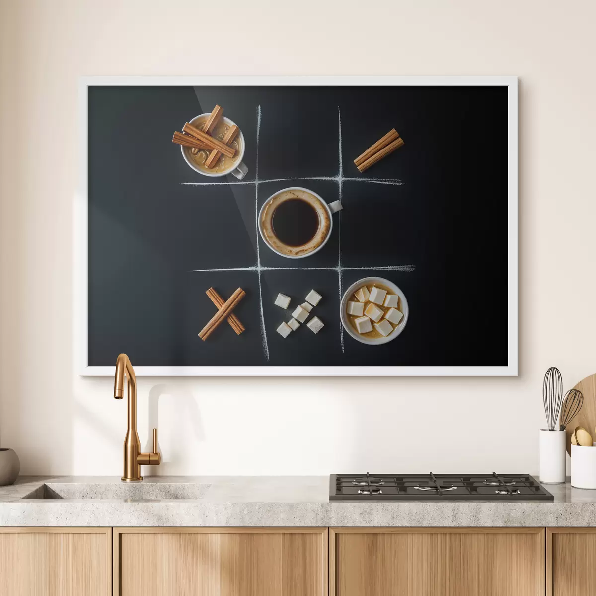 Plakatas Puodelis kavos su cinamono lazdelėmis, cukraus kubeliais ir zefyrais, išdėstytais „tic-tac-toe“ tinklelyje f40163