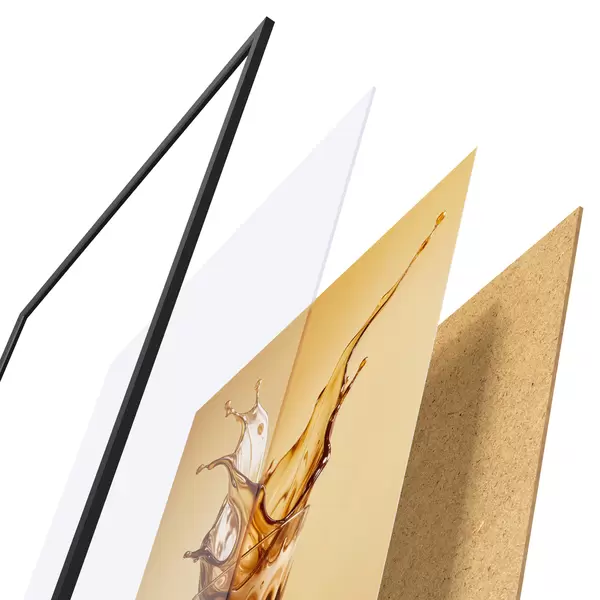 Plakatą sudaro rėmas, pleksiklas, atspausdintas vaizdas ir medžio drožlių plokštės pagrindas. Plakatą galima iš karto pakabinti ant sienos dėl kitoje pusėje esančių laikiklių.