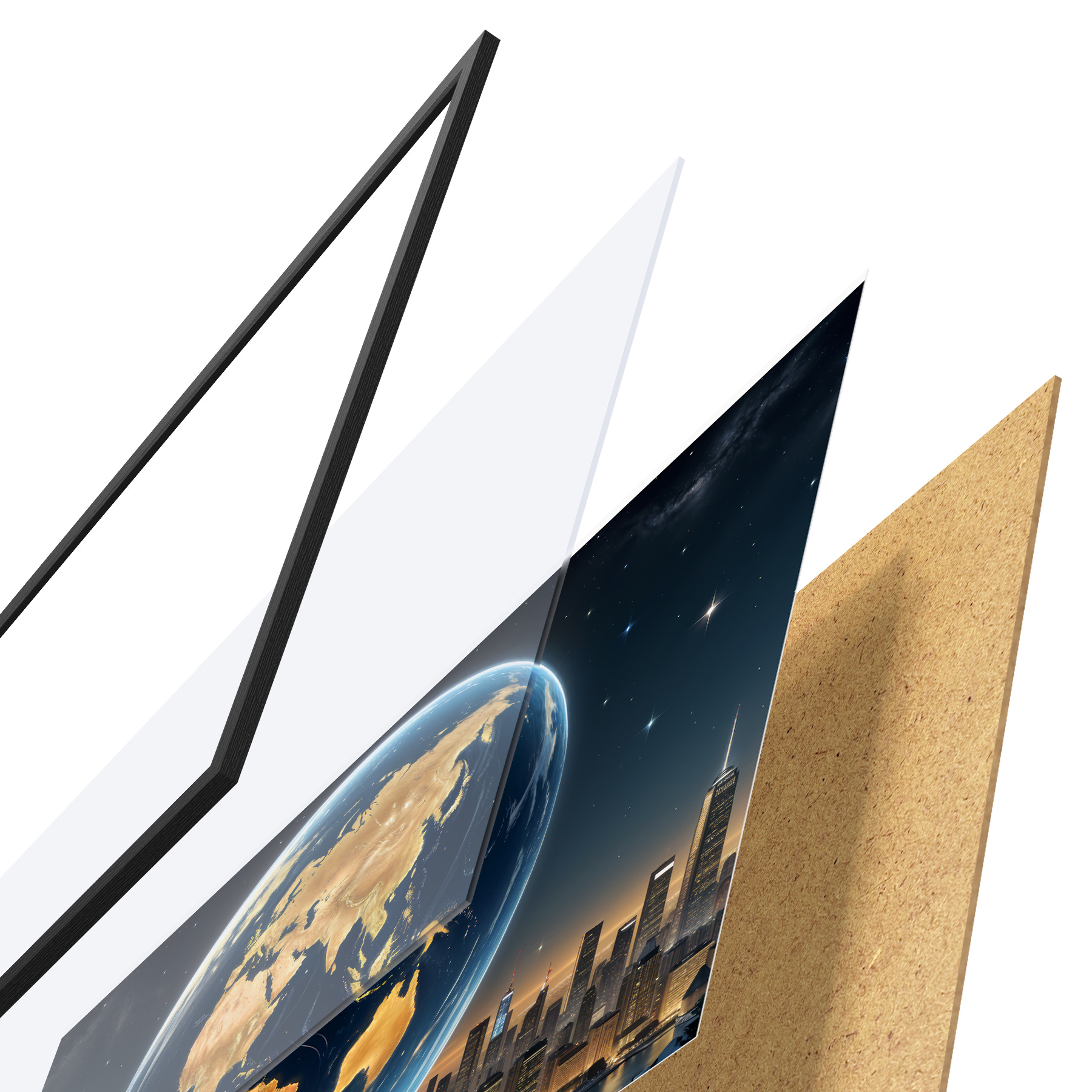 Plakatą sudaro rėmas, pleksiklas, atspausdintas vaizdas ir medžio drožlių plokštės pagrindas. Plakatą galima iš karto pakabinti ant sienos dėl kitoje pusėje esančių laikiklių.