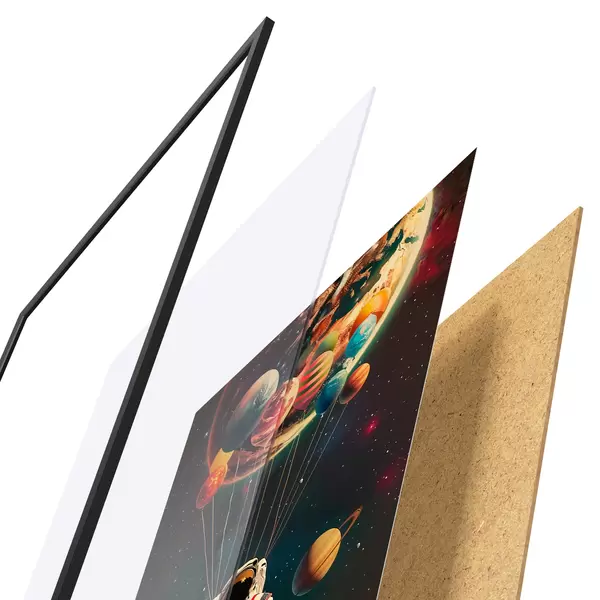 Plakatą sudaro rėmas, pleksiklas, atspausdintas vaizdas ir medžio drožlių plokštės pagrindas. Plakatą galima iš karto pakabinti ant sienos dėl kitoje pusėje esančių laikiklių.