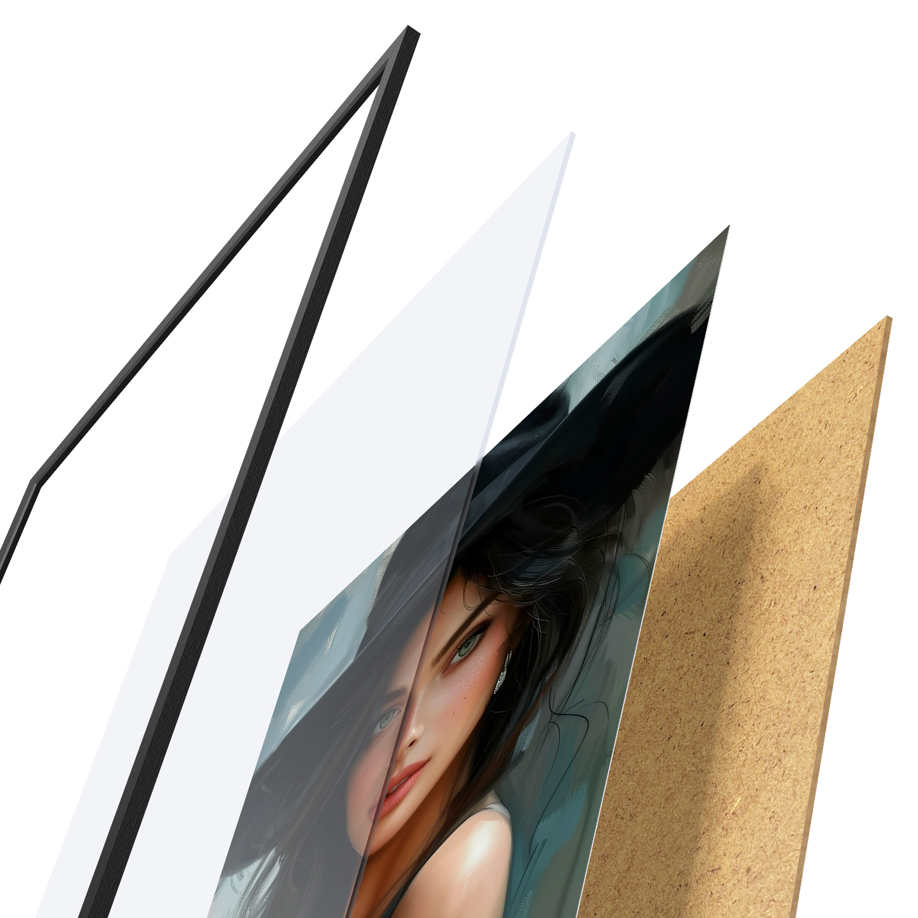 Plakatą sudaro rėmas, pleksiklas, atspausdintas vaizdas ir medžio drožlių plokštės pagrindas. Plakatą galima iš karto pakabinti ant sienos dėl kitoje pusėje esančių laikiklių.