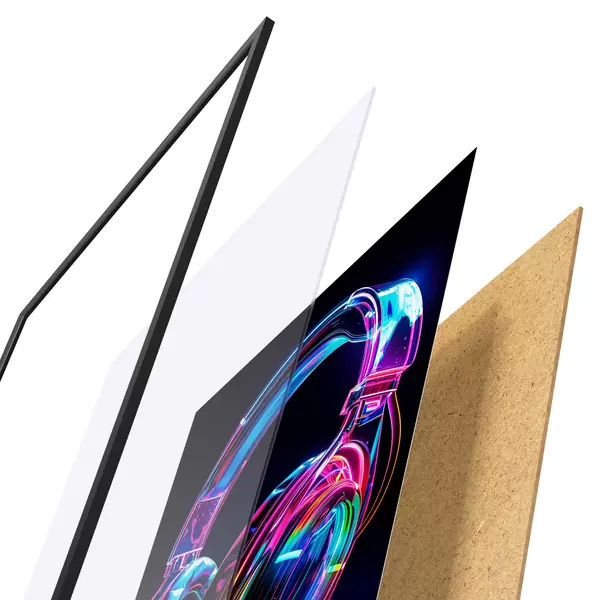 Plakatą sudaro rėmas, pleksiklas, atspausdintas vaizdas ir medžio drožlių plokštės pagrindas. Plakatą galima iš karto pakabinti ant sienos dėl kitoje pusėje esančių laikiklių.