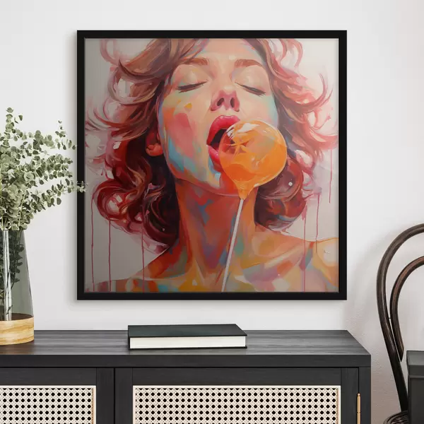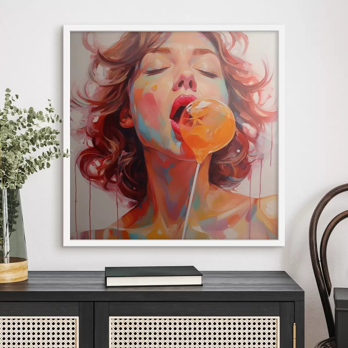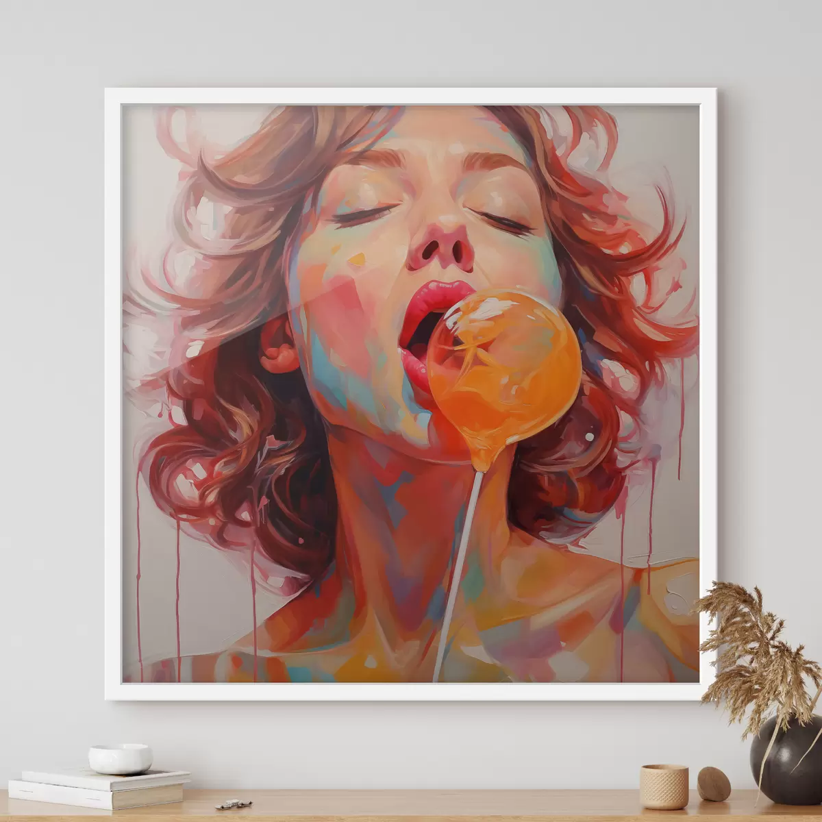 Plakatas Šviesių spalvų garbanotais plaukais mergaitė laižo saldainį f40213