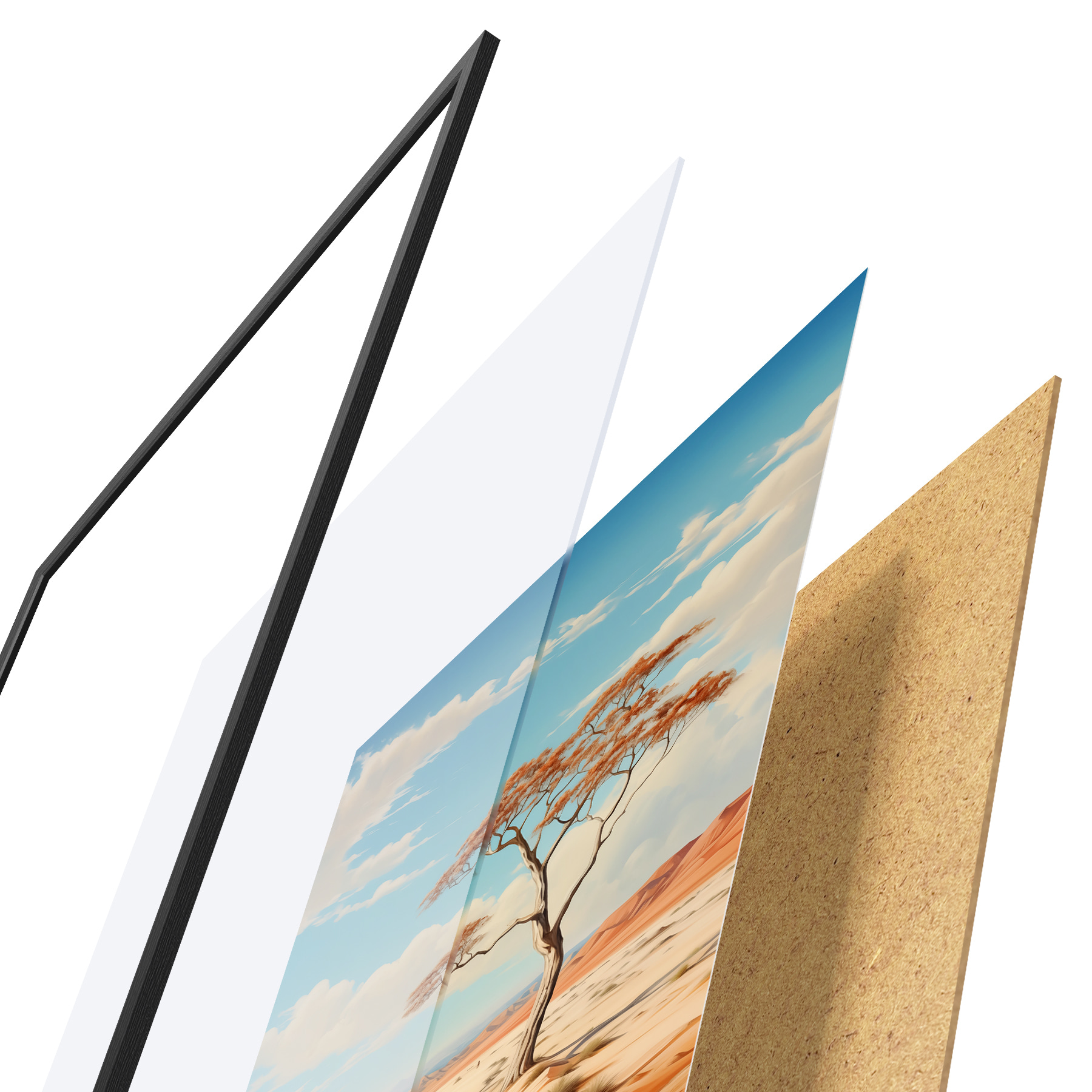 Plakatą sudaro rėmas, pleksiklas, atspausdintas vaizdas ir medžio drožlių plokštės pagrindas. Plakatą galima iš karto pakabinti ant sienos dėl kitoje pusėje esančių laikiklių.