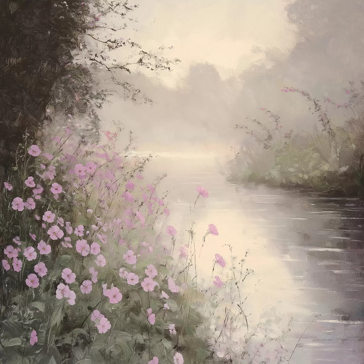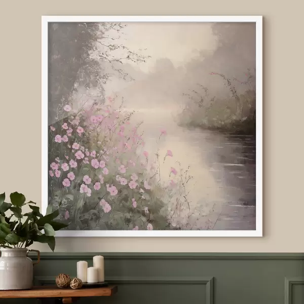 Plakatas Ežeras su rožinėmis gėlėmis, saulėtekis, aliejinis piešinys, pastelinės smėlio spalvos, migla Ne f40229
