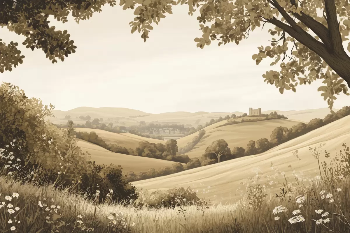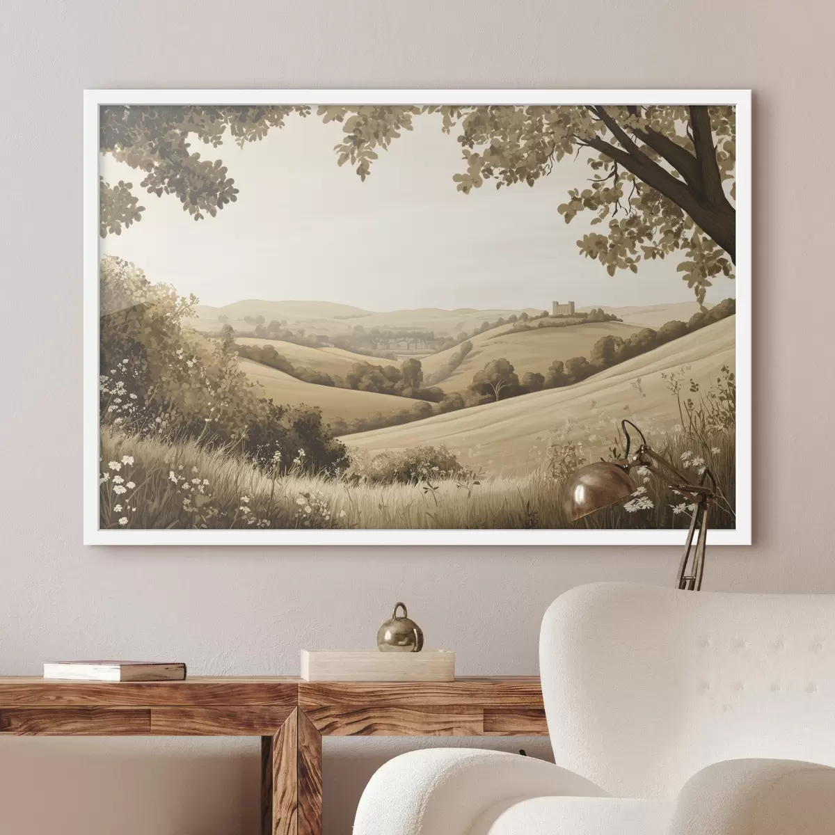 Plakatas Gamtos peizažas smėlio spalvos paletėje, pieva, gėlės, medžiai, pilis f40230