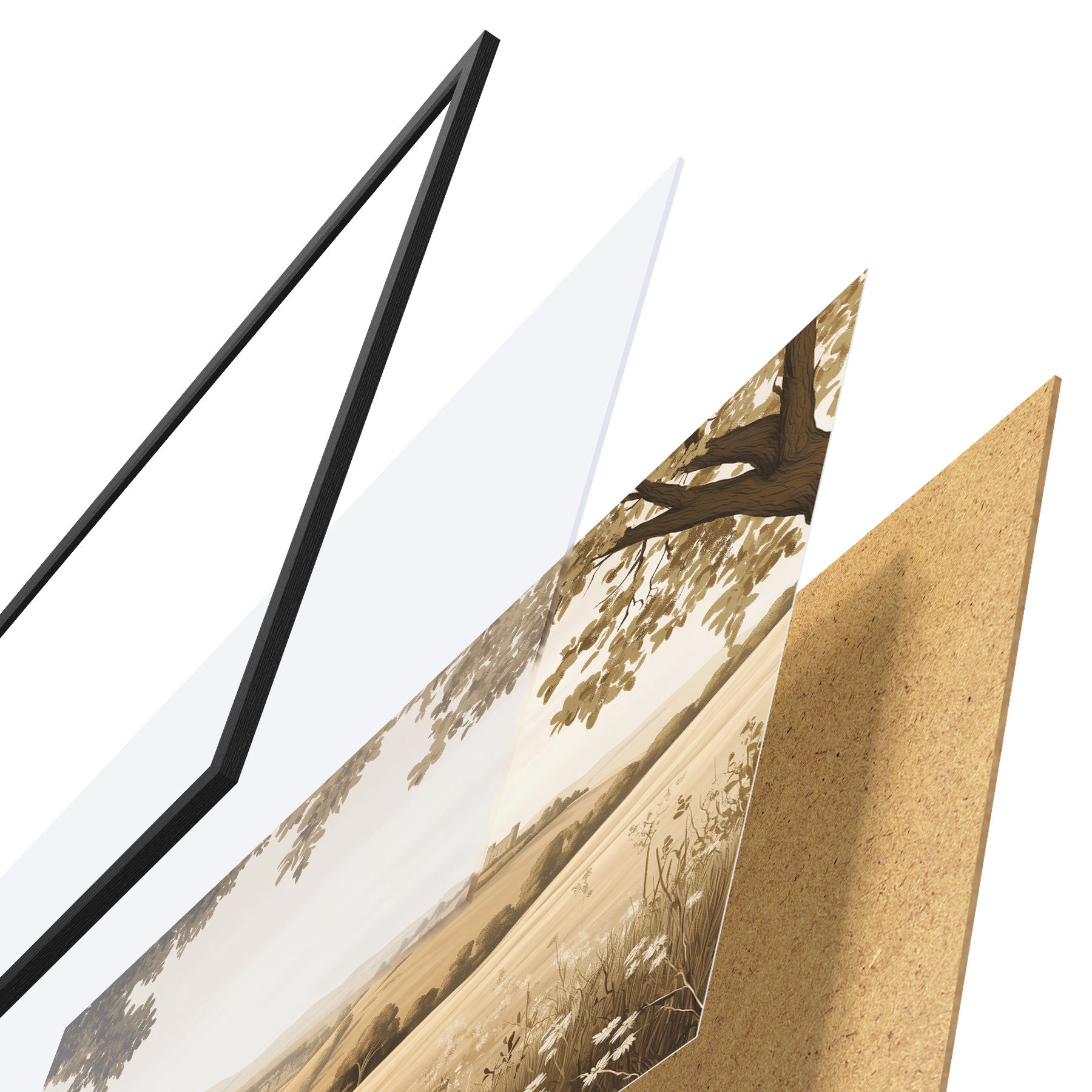 Plakatą sudaro rėmas, pleksiklas, atspausdintas vaizdas ir medžio drožlių plokštės pagrindas. Plakatą galima iš karto pakabinti ant sienos dėl kitoje pusėje esančių laikiklių.