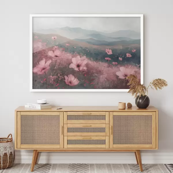 Plakatas Rožinės gėlės pievoje, gamtos peizažas, kalnai, aliejinė tapyba, ryškūs potėpiai Ne f40233
