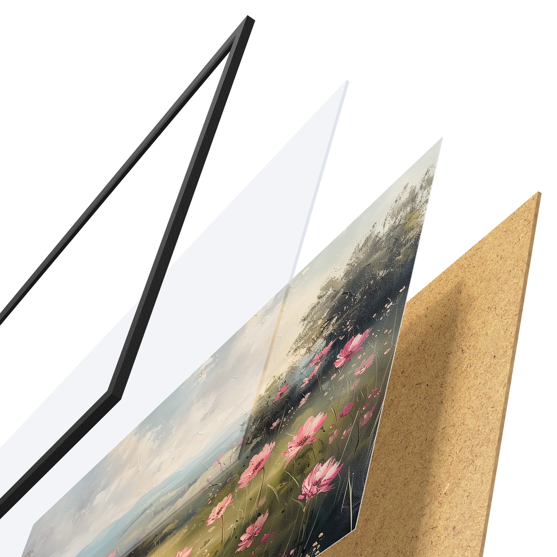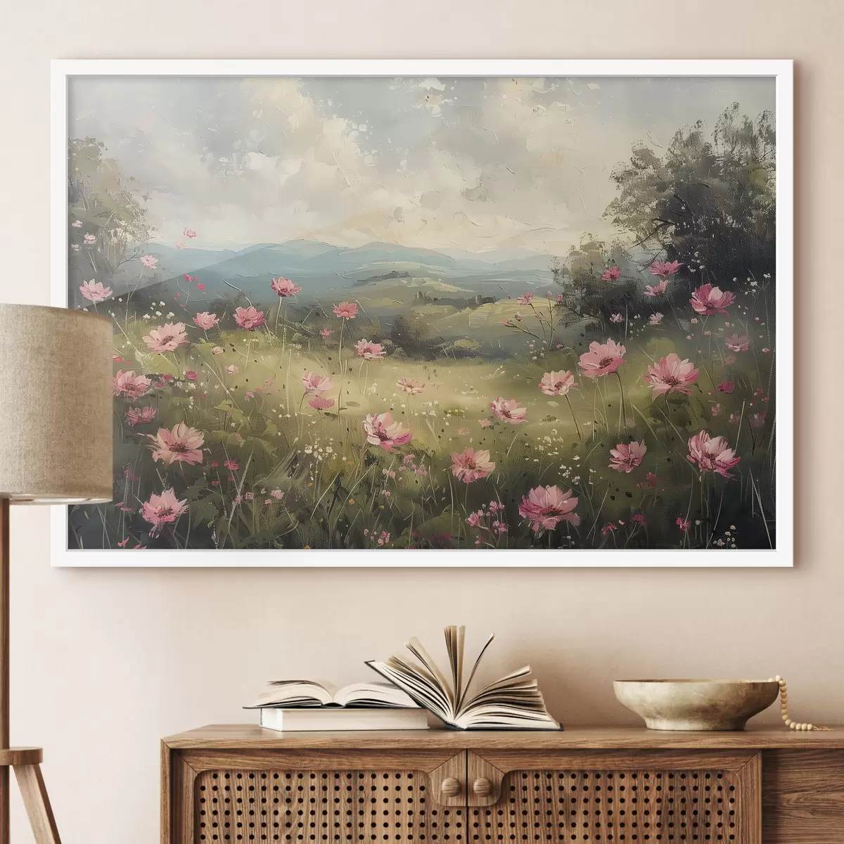 Plakatas Pieva su rožinėmis gėlėmis, žalia žolė, gamtos peizažas, dangus su debesimis, akrilo piešinys f40234