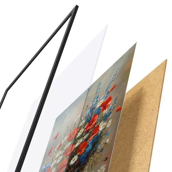 Plakatą sudaro rėmas, pleksiklas, atspausdintas vaizdas ir medžio drožlių plokštės pagrindas. Plakatą galima iš karto pakabinti ant sienos dėl kitoje pusėje esančių laikiklių.