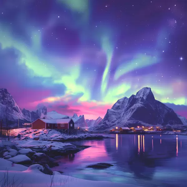 Plakatas Šiaurės pašvaistės Lofoteno salose, Norvegija gamta, žiema Ne f40298