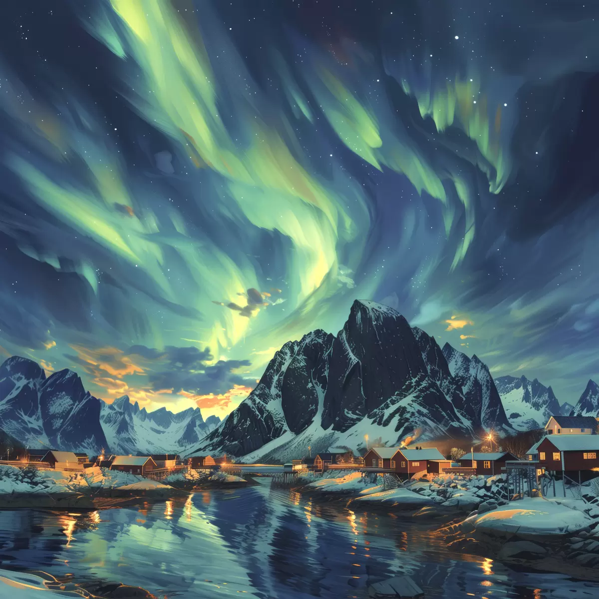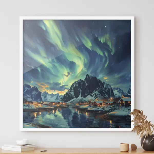 Plakatas Lofoteno salos, žiemos kaimas, žiemos žiburiai f40299