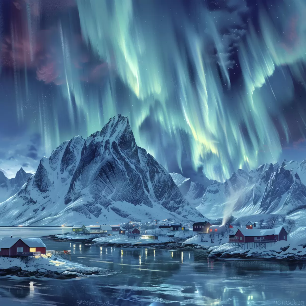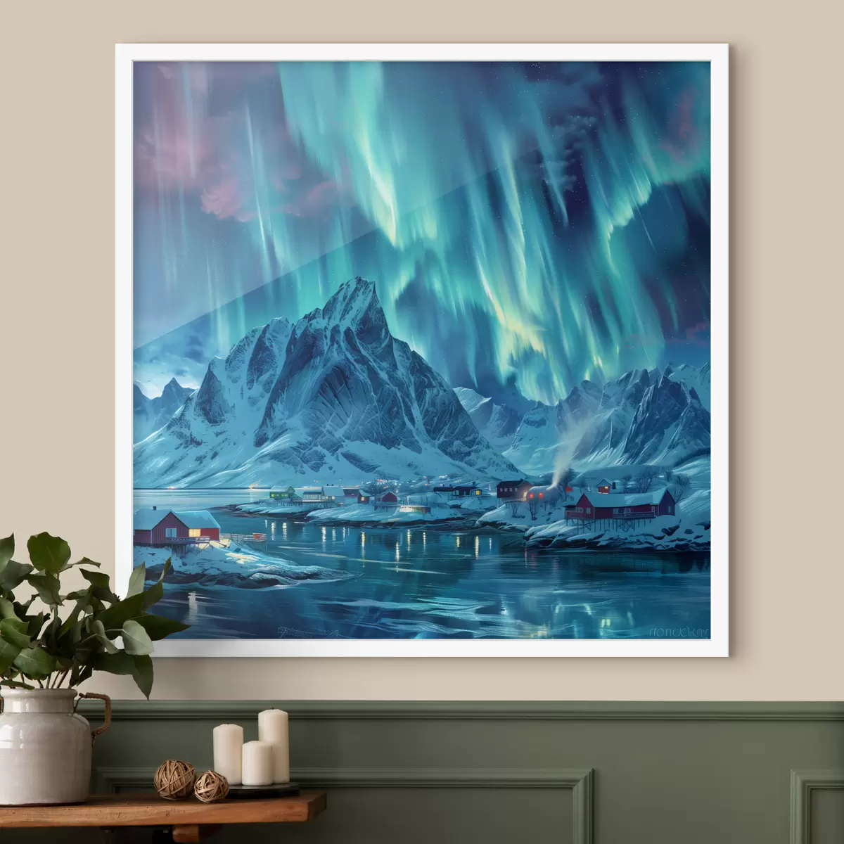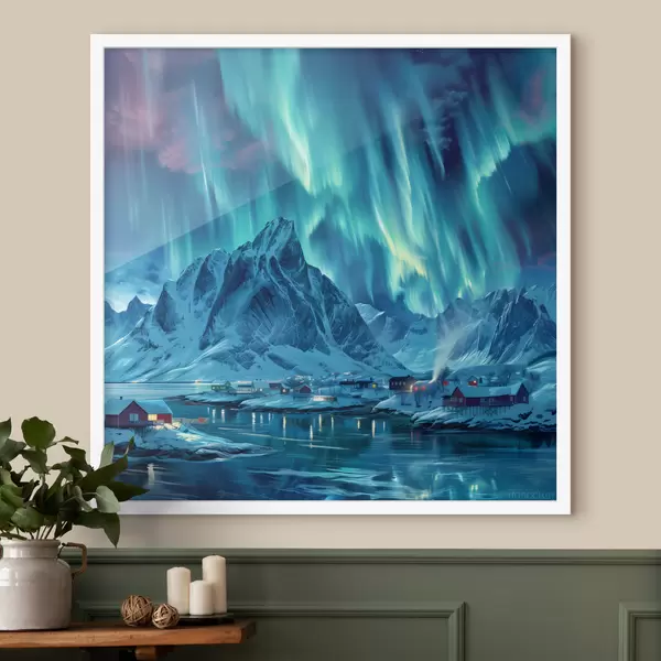 Plakatas Magiškos šiaurės pašvaistės, žiemos kaimas Norvegijoje f40301