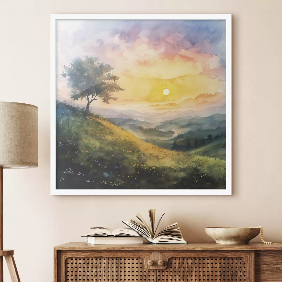 Plakatas Pieva su kalvomis ir medžiu, gėlės, akvarelė Ne f40303