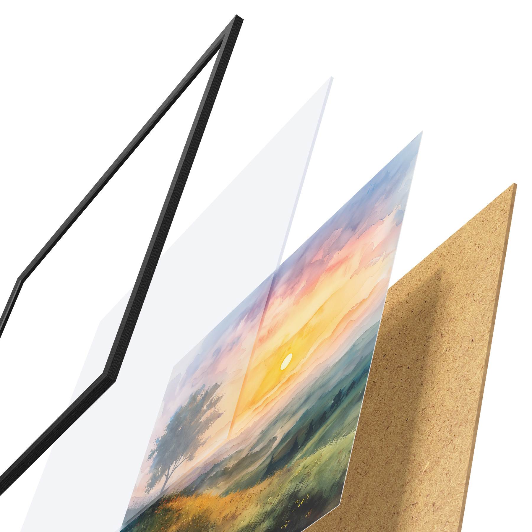 Plakatą sudaro rėmas, pleksiklas, atspausdintas vaizdas ir medžio drožlių plokštės pagrindas. Plakatą galima iš karto pakabinti ant sienos dėl kitoje pusėje esančių laikiklių.