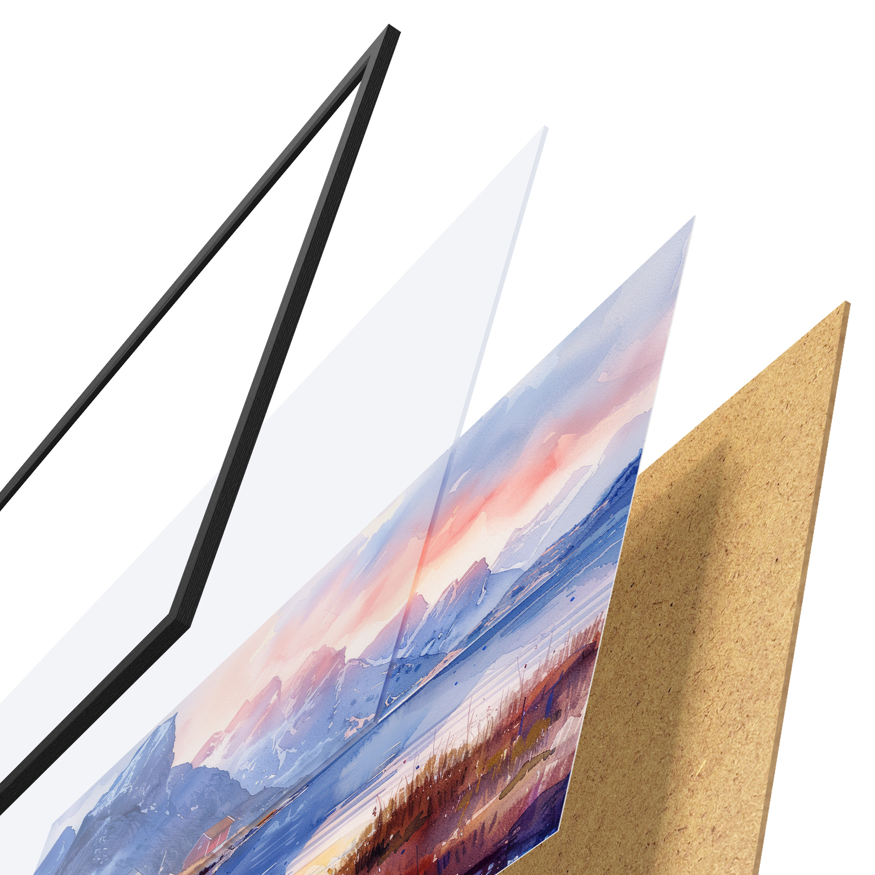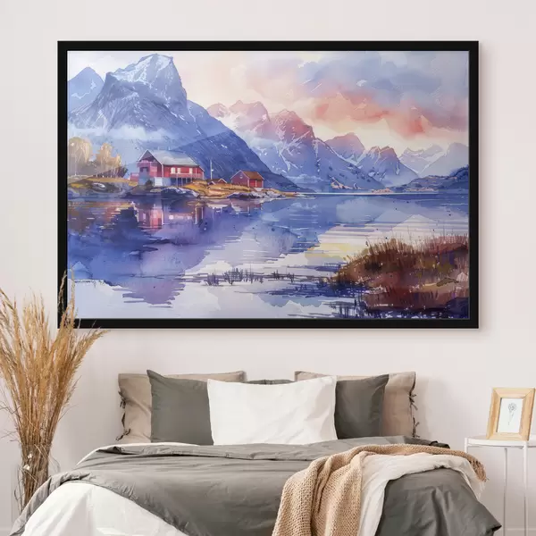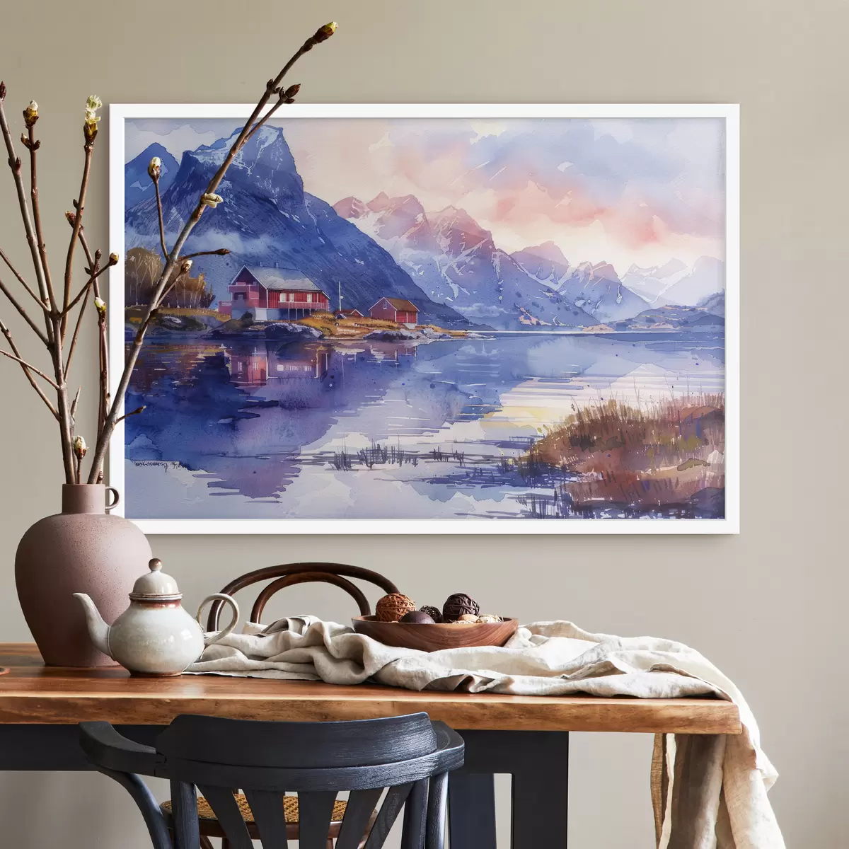 Plakatas Norvegijos kaimas, saulėlydžio dangus, rami upė, kalnai, akvarelė Ne f40311