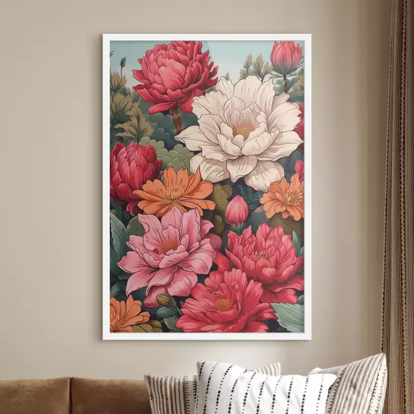Plakatas Ryškios chrizantemos, balta, žalia, oranžinė, raudona f40315