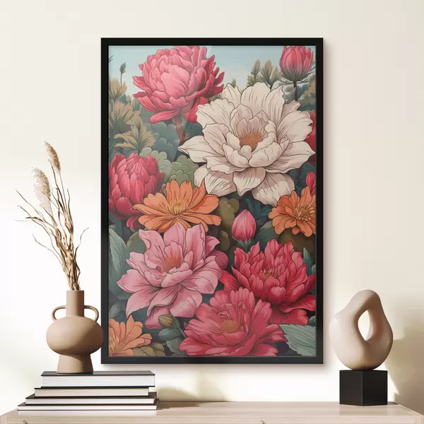 Plakatas Ryškios chrizantemos, balta, žalia, oranžinė, raudona Ne f40315