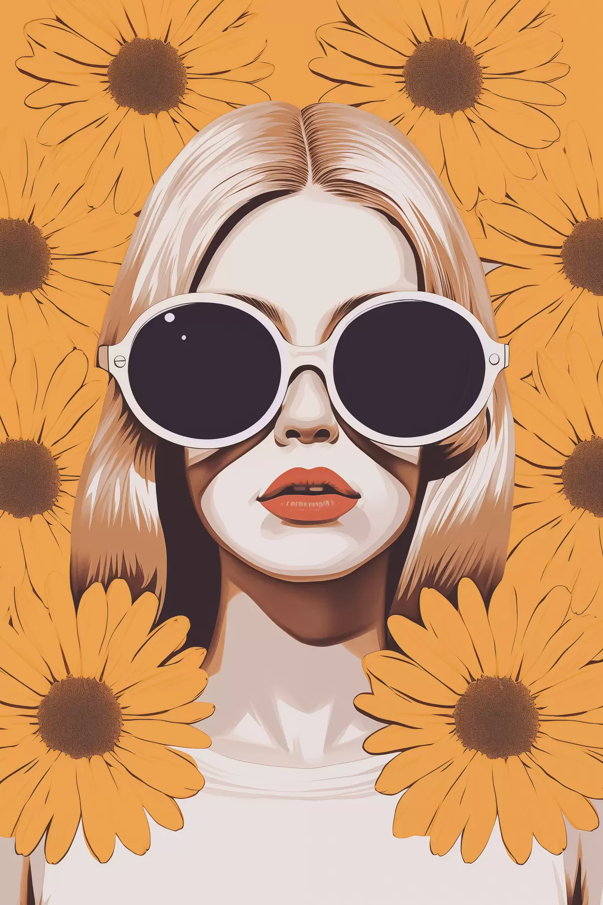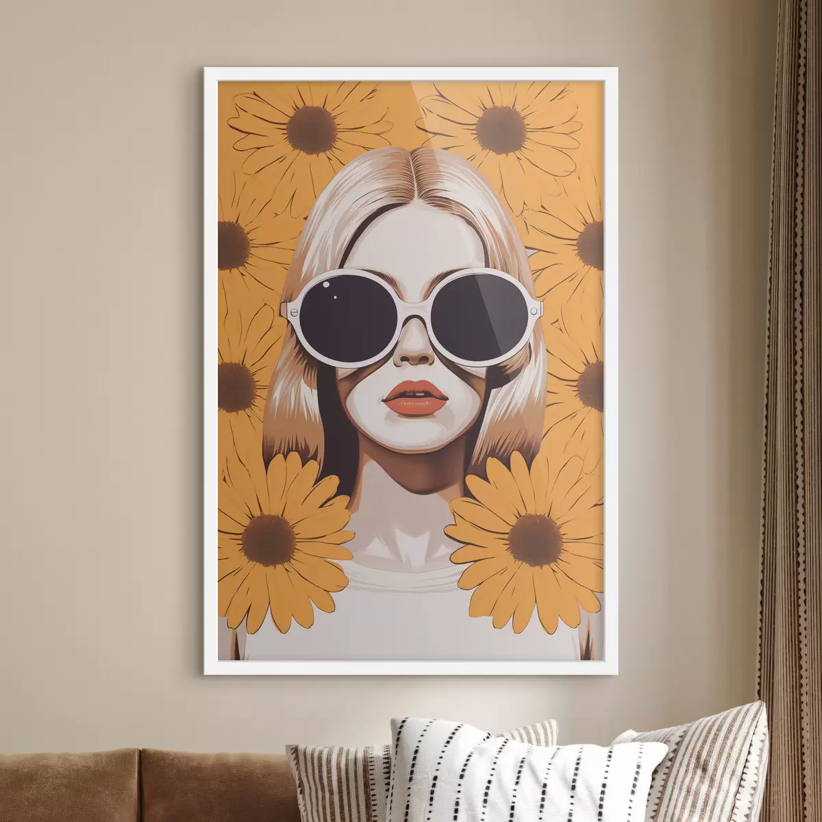 Plakatas Mergina su dideliais akiniais nuo saulės su geltonomis ramunėlėmis retro stiliaus f40317