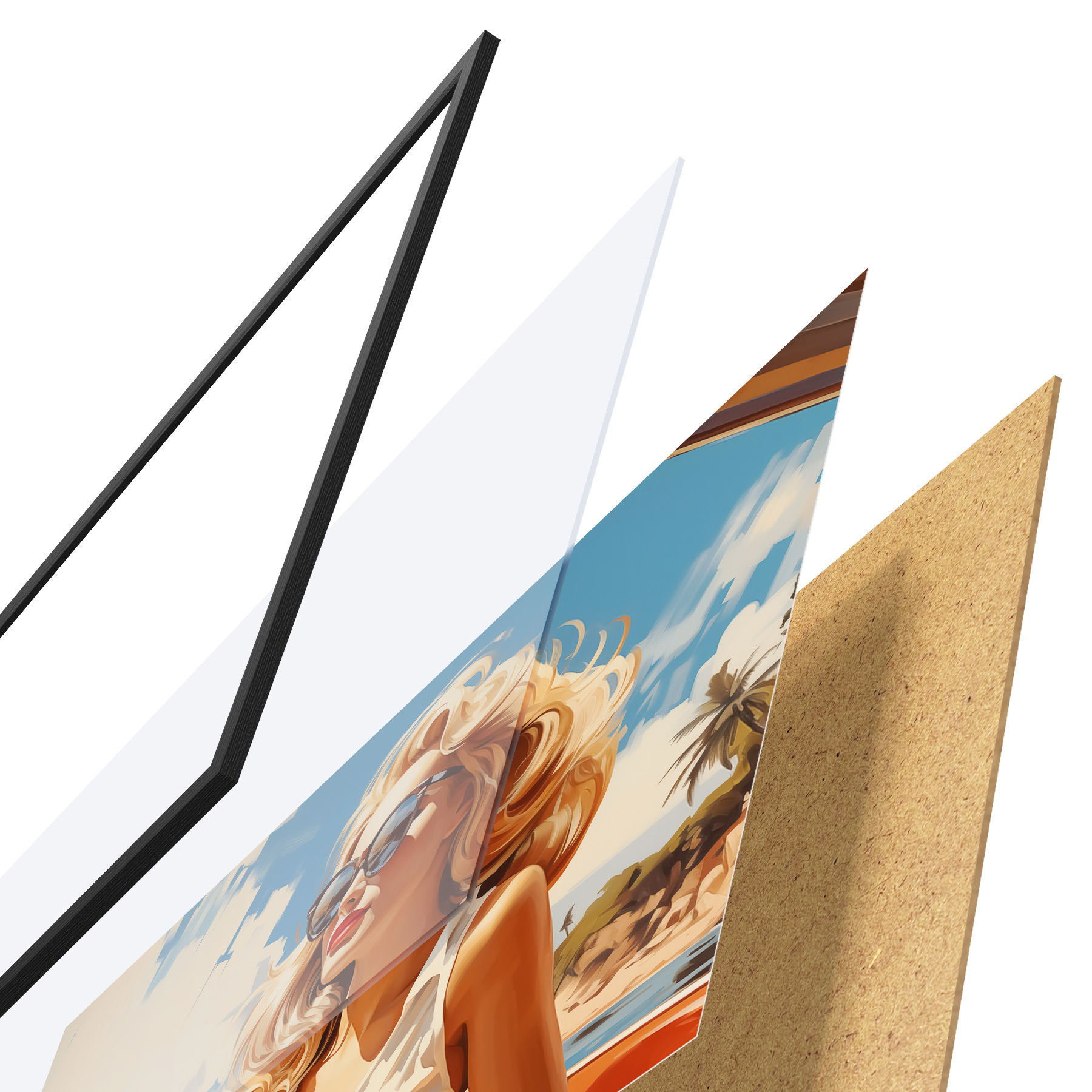 Plakatą sudaro rėmas, pleksiklas, atspausdintas vaizdas ir medžio drožlių plokštės pagrindas. Plakatą galima iš karto pakabinti ant sienos dėl kitoje pusėje esančių laikiklių.