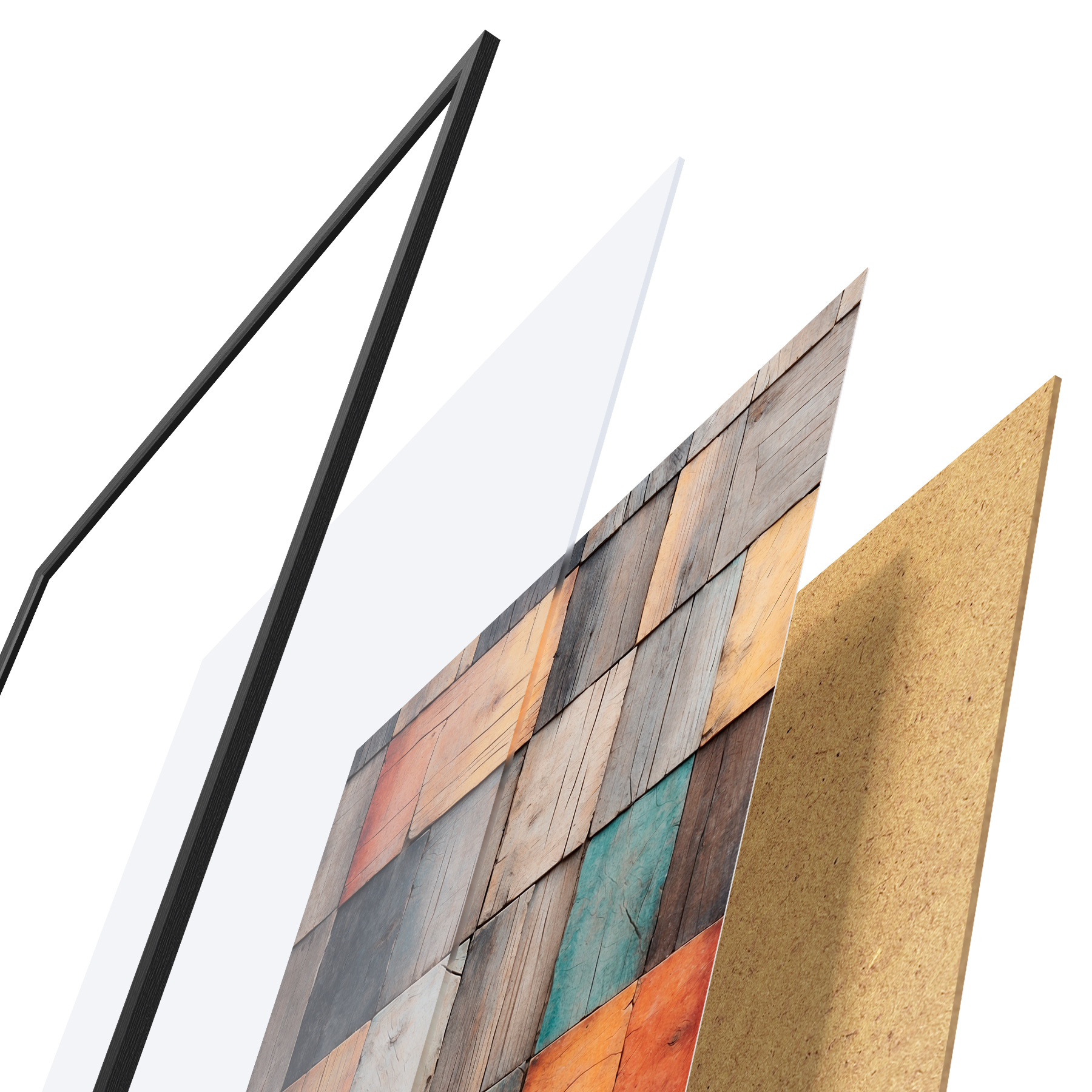 Plakatą sudaro rėmas, pleksiklas, atspausdintas vaizdas ir medžio drožlių plokštės pagrindas. Plakatą galima iš karto pakabinti ant sienos dėl kitoje pusėje esančių laikiklių.
