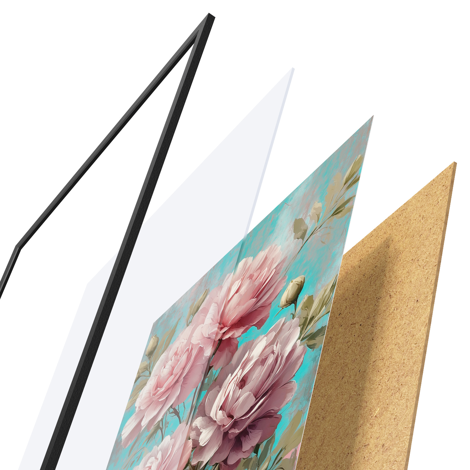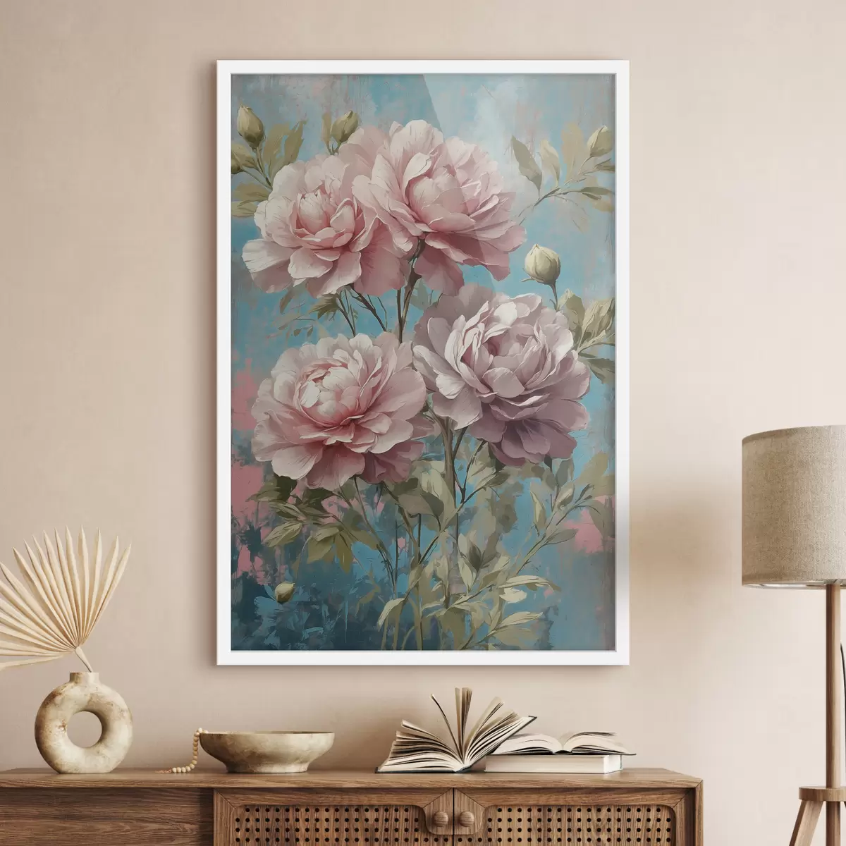 Plakatas Rožinės gėlės baltai mėlyname fone f40344