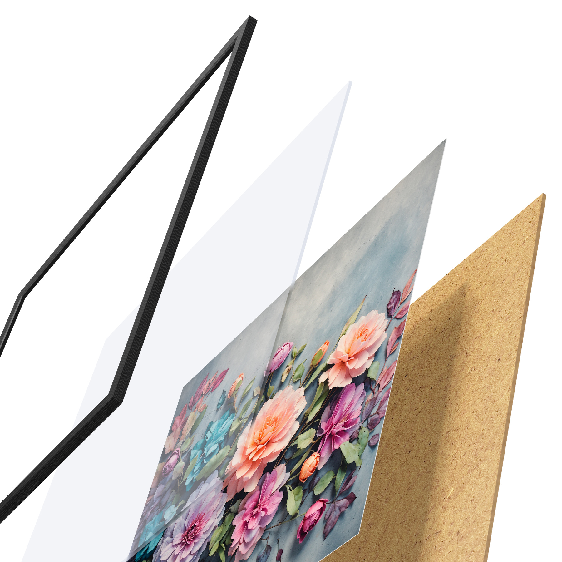 Plakatą sudaro rėmas, pleksiklas, atspausdintas vaizdas ir medžio drožlių plokštės pagrindas. Plakatą galima iš karto pakabinti ant sienos dėl kitoje pusėje esančių laikiklių.