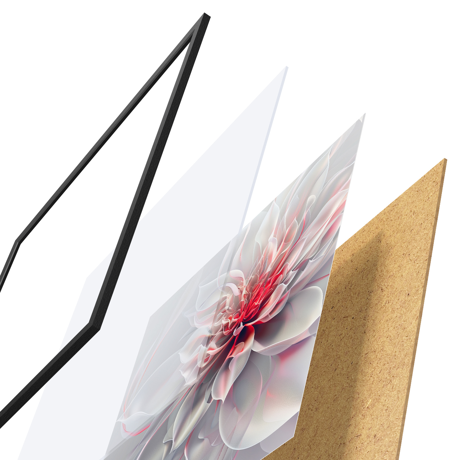 Plakatą sudaro rėmas, pleksiklas, atspausdintas vaizdas ir medžio drožlių plokštės pagrindas. Plakatą galima iš karto pakabinti ant sienos dėl kitoje pusėje esančių laikiklių.