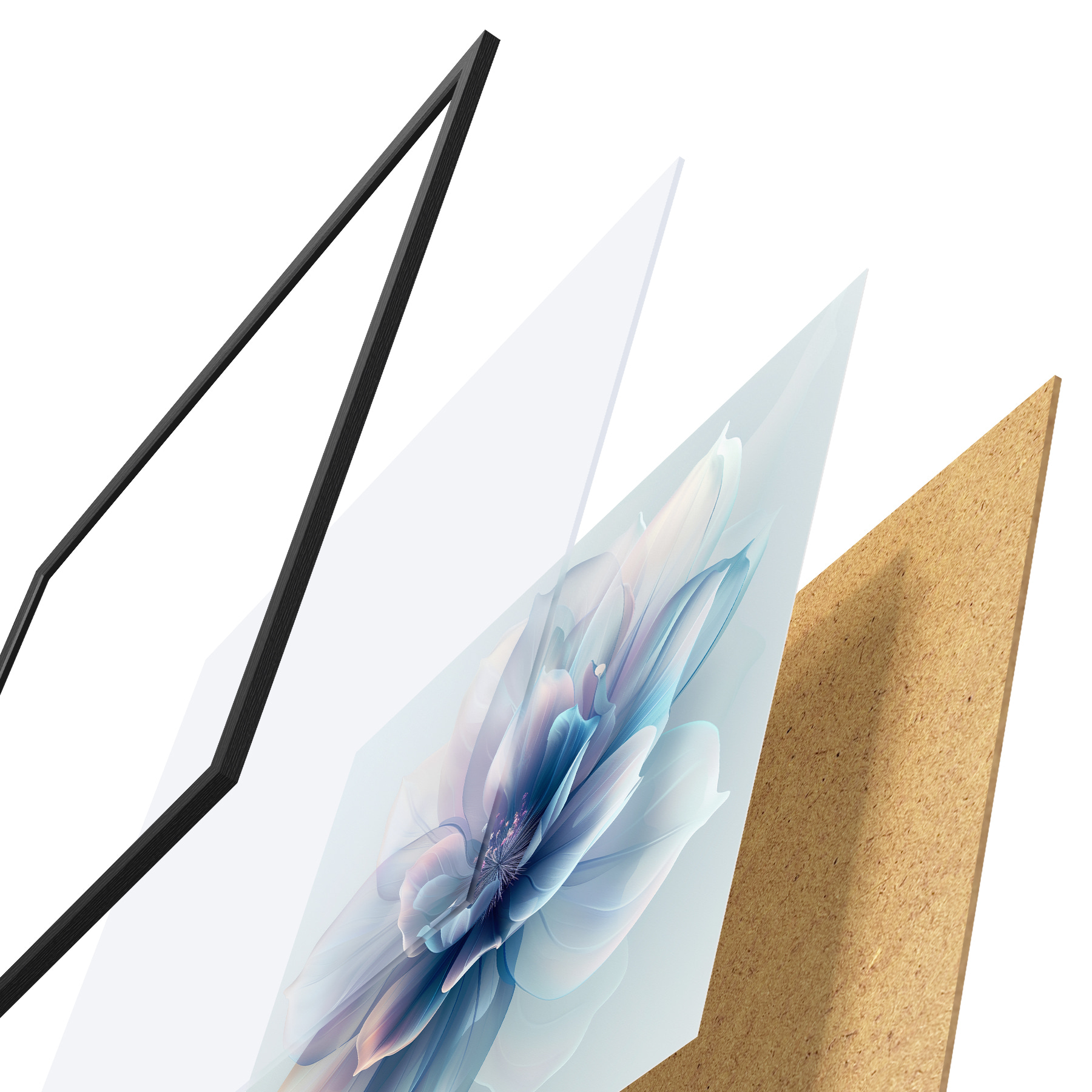 Plakatą sudaro rėmas, pleksiklas, atspausdintas vaizdas ir medžio drožlių plokštės pagrindas. Plakatą galima iš karto pakabinti ant sienos dėl kitoje pusėje esančių laikiklių.
