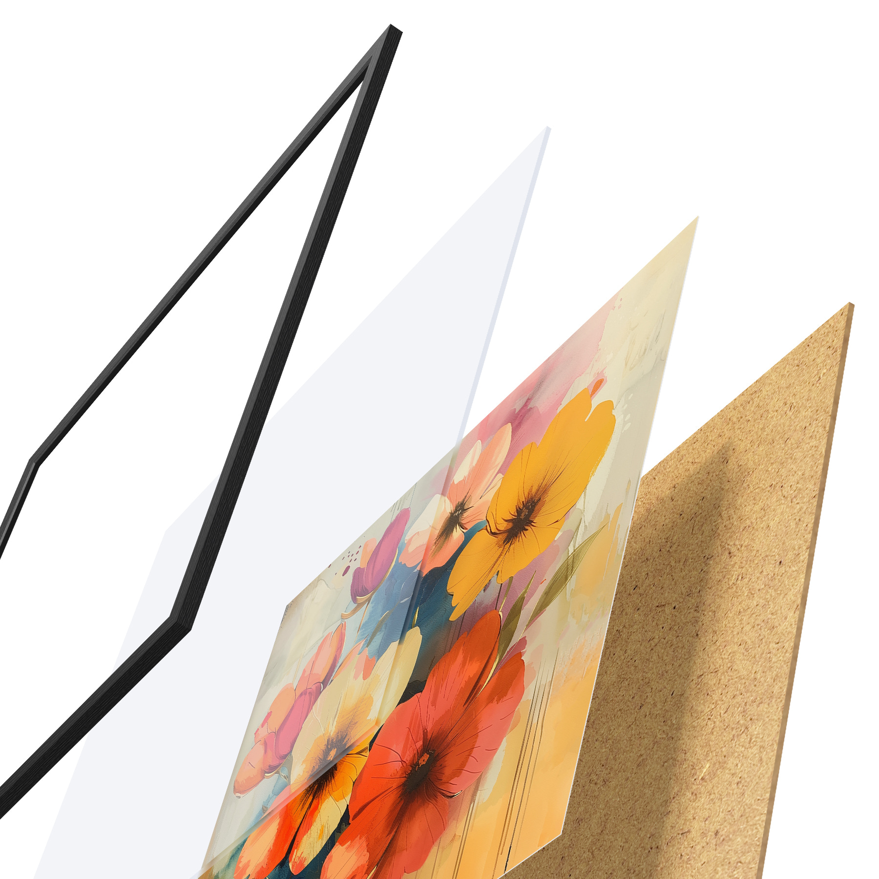 Plakatą sudaro rėmas, pleksiklas, atspausdintas vaizdas ir medžio drožlių plokštės pagrindas. Plakatą galima iš karto pakabinti ant sienos dėl kitoje pusėje esančių laikiklių.