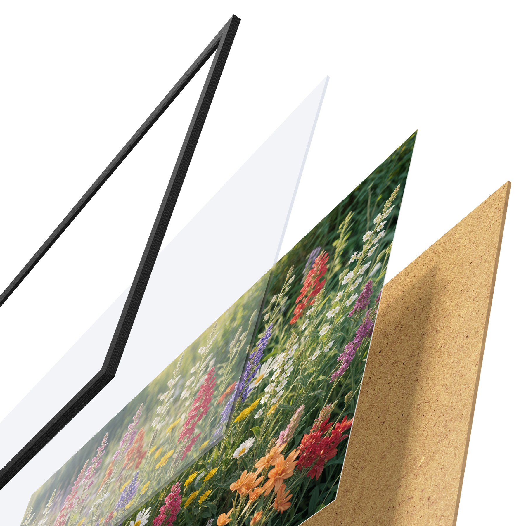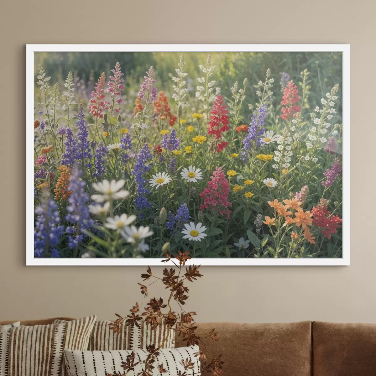 Plakatas Spalvinga lauko gėlių pieva su įvairiomis žydinčiomis gėlėmis, įskaitant ramunes, levandas ir raudonas gėles f40390