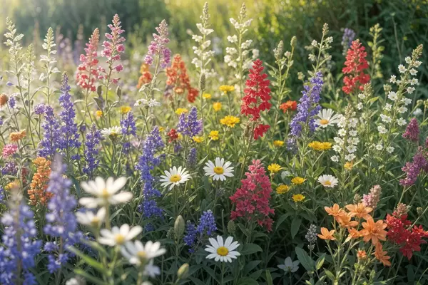 Plakatas Spalvinga lauko gėlių pieva su įvairiomis žydinčiomis gėlėmis, įskaitant ramunes, levandas ir raudonas gėles f40390