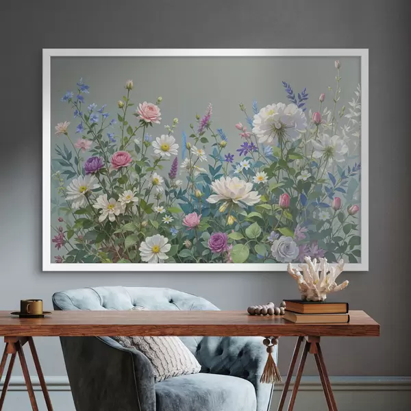 Plakatas Vešlus, gyvybingas sodas, pilnas įvairių spalvingų gėlių ir žydinčių augalų pilkame fone f40393