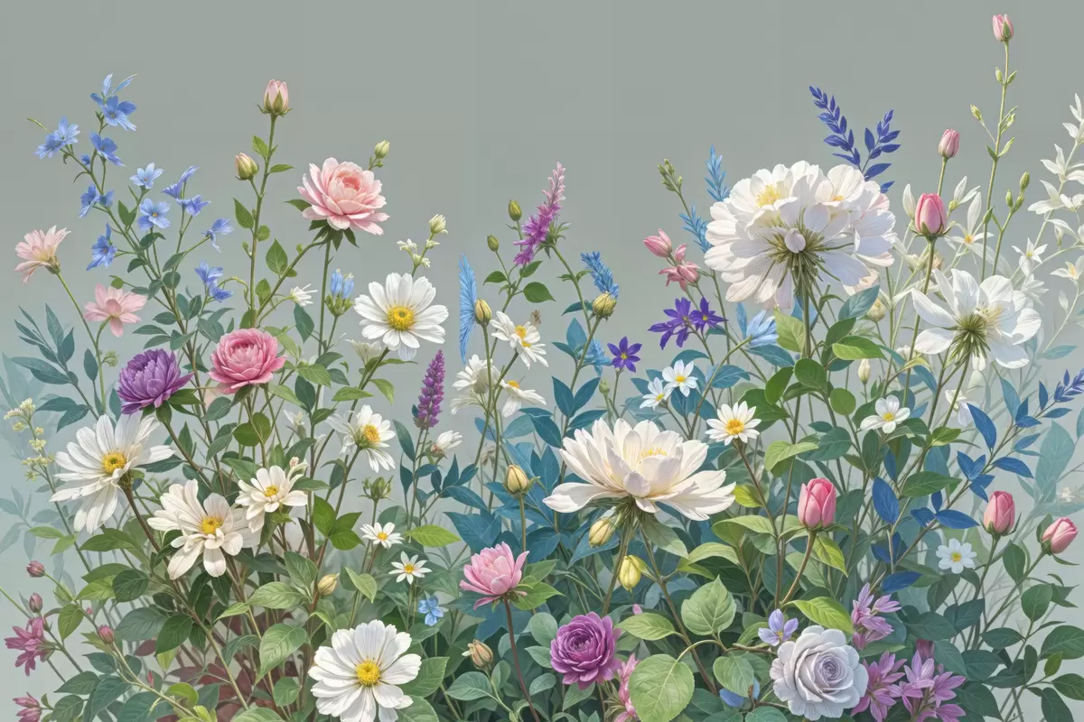 Plakatas Vešlus, gyvybingas sodas, pilnas įvairių spalvingų gėlių ir žydinčių augalų pilkame fone f40393