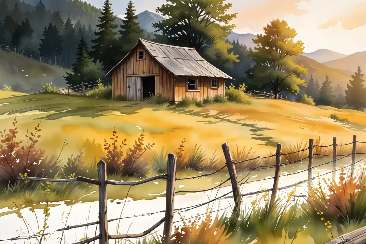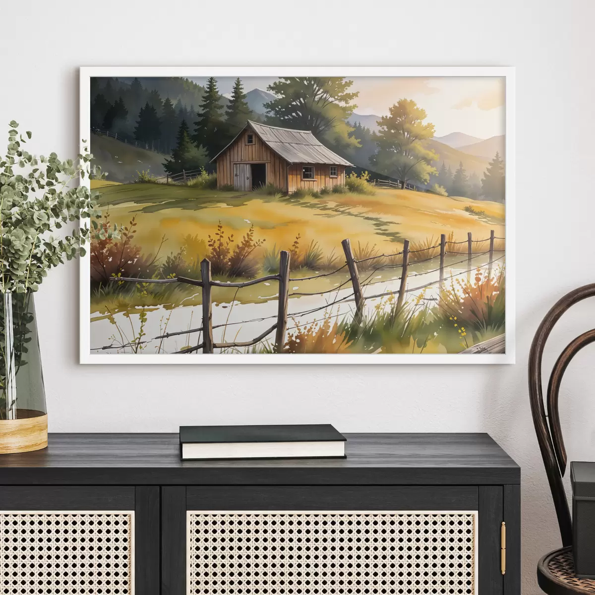 Plakatas Senas medinis namas kaimo vietovėje, apsuptas žolingo lauko, pušų ir kalnų f40394