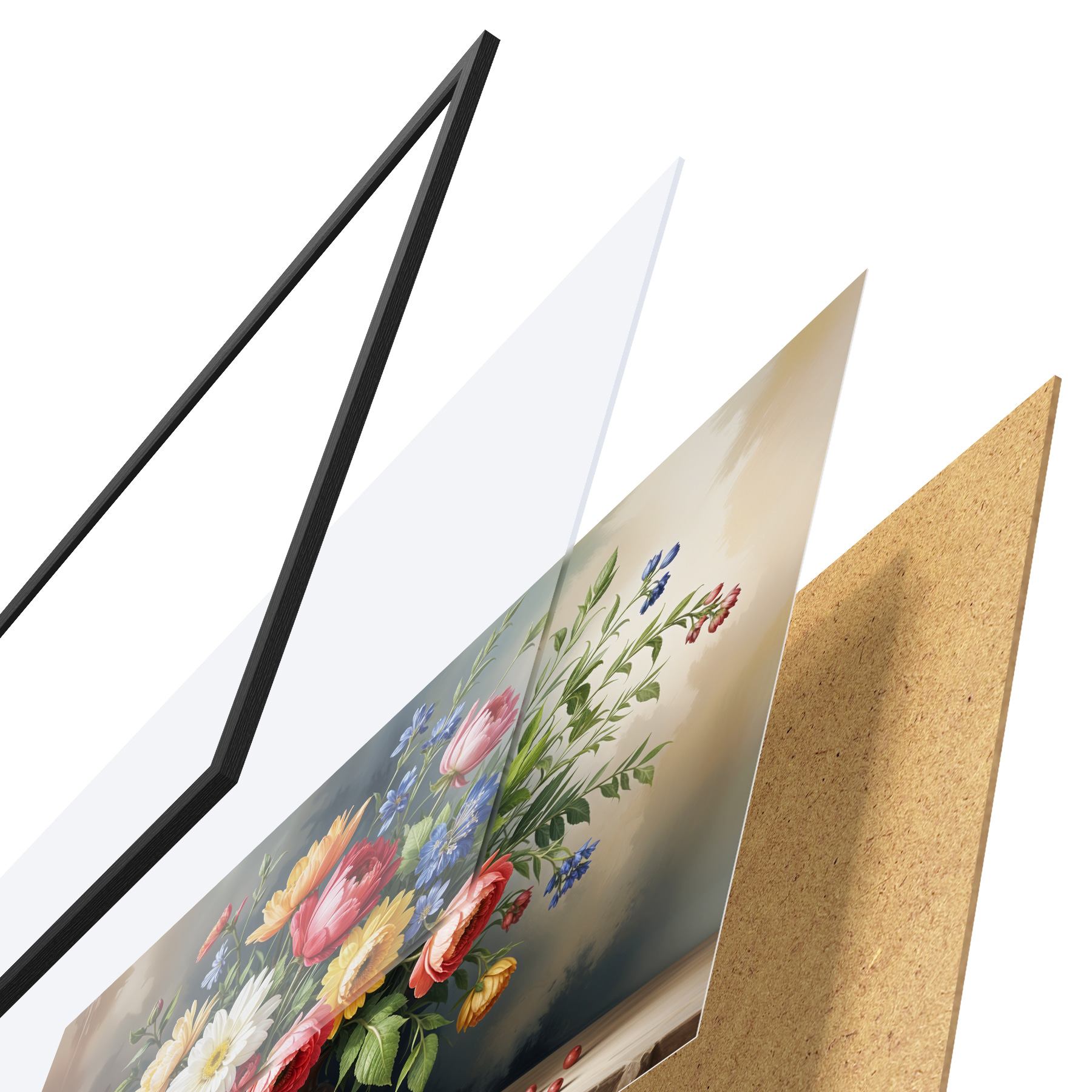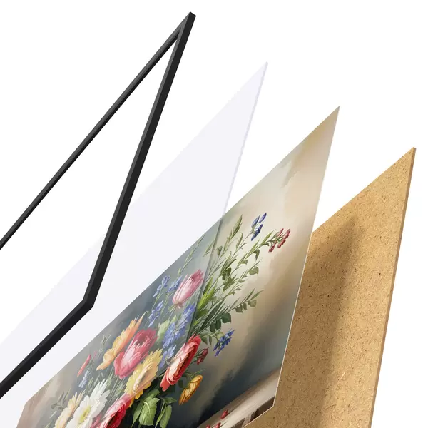 Plakatą sudaro rėmas, pleksiklas, atspausdintas vaizdas ir medžio drožlių plokštės pagrindas. Plakatą galima iš karto pakabinti ant sienos dėl kitoje pusėje esančių laikiklių.