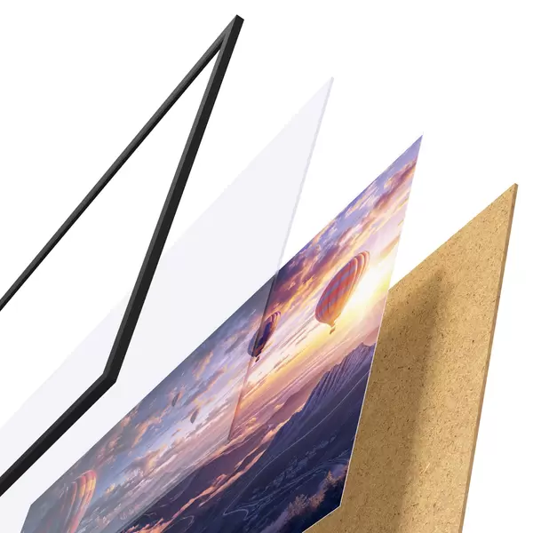 Plakatą sudaro rėmas, pleksiklas, atspausdintas vaizdas ir medžio drožlių plokštės pagrindas. Plakatą galima iš karto pakabinti ant sienos dėl kitoje pusėje esančių laikiklių.