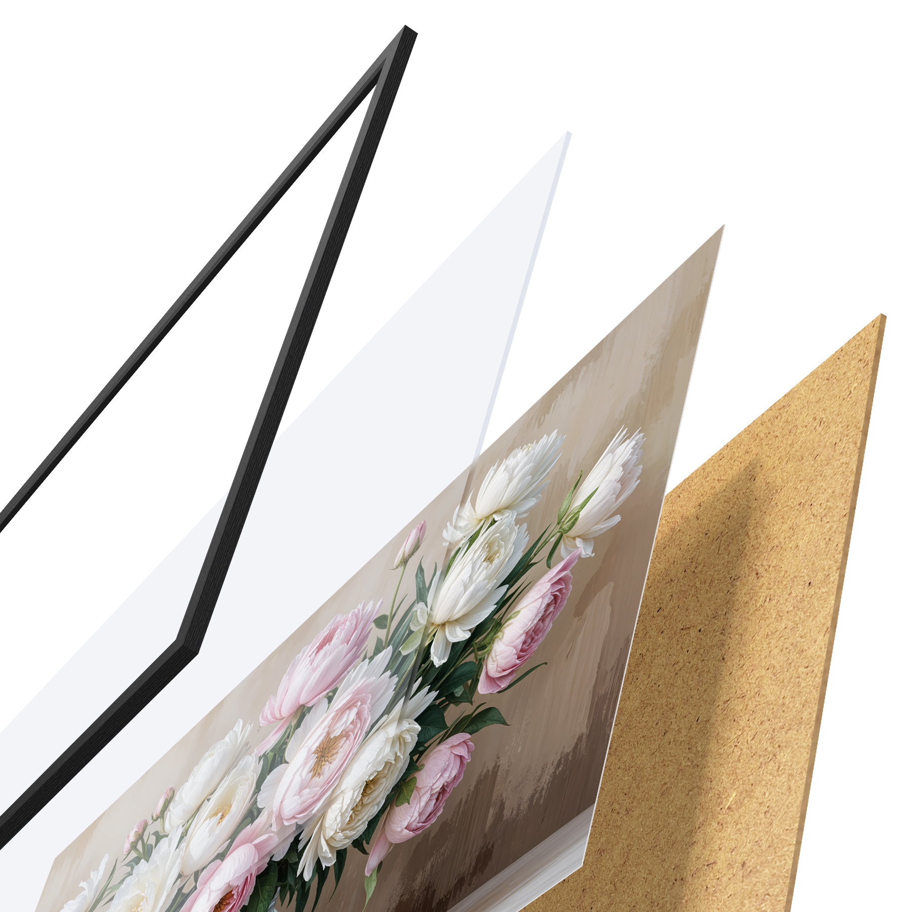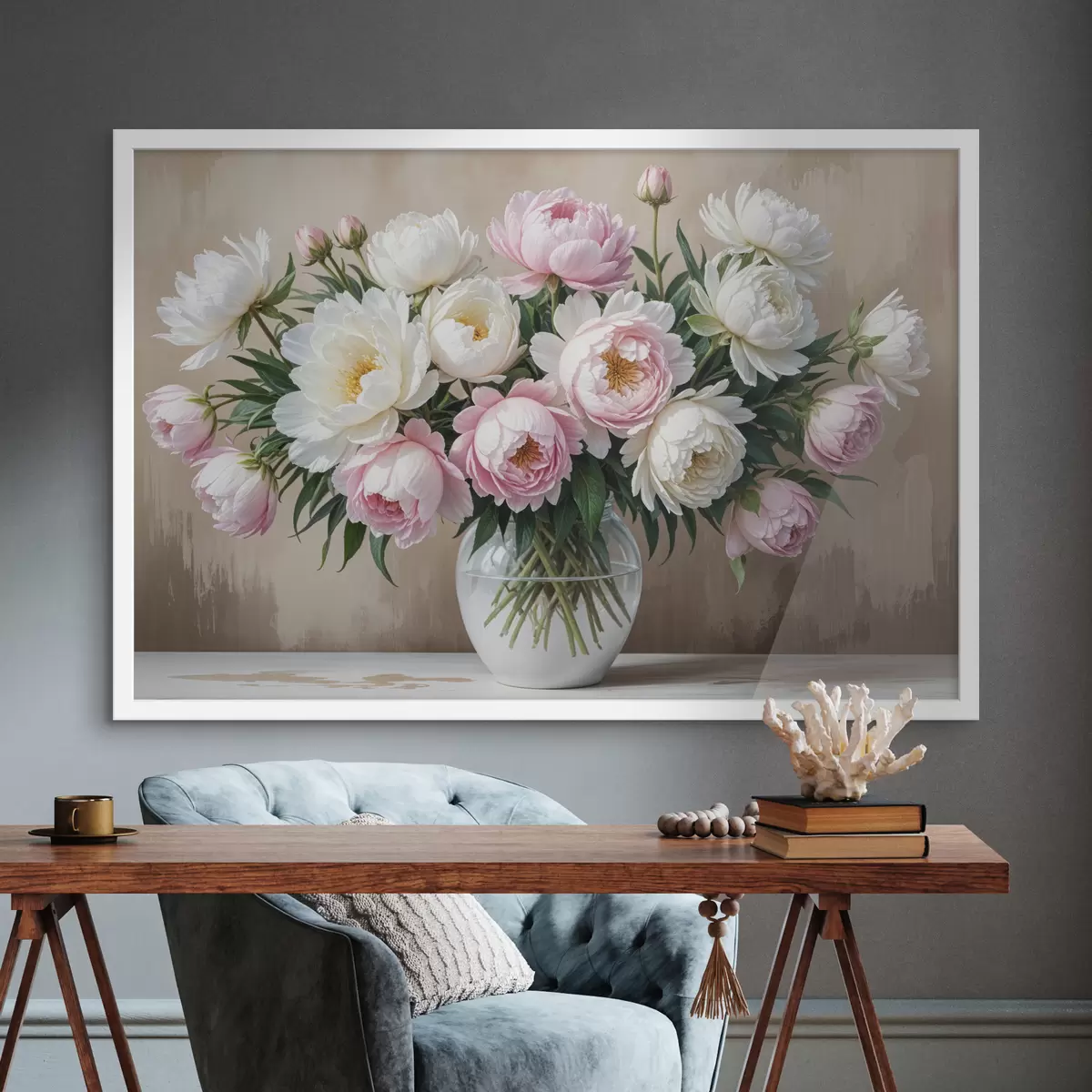 Plakatas Gražių rožinių ir baltų bijūnų puokštė stiklinėje vazoje, išdėliota ant medinio paviršiaus f40398