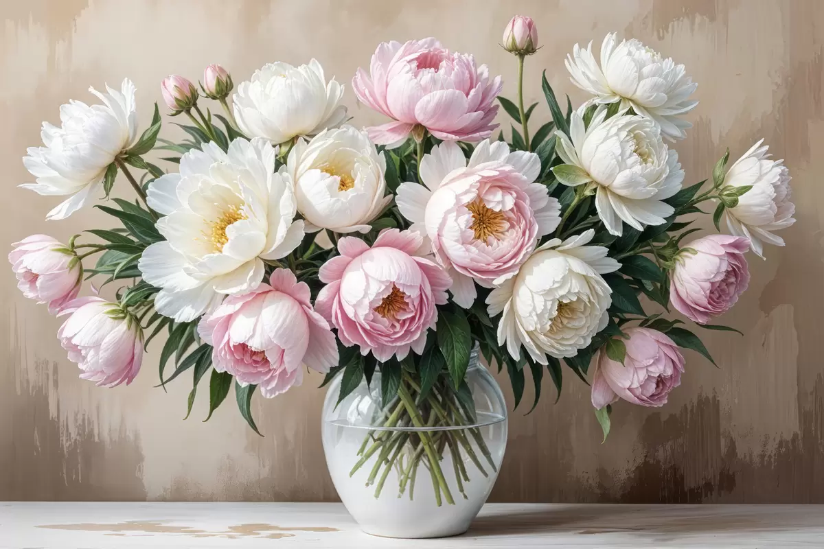 Plakatas Gražių rožinių ir baltų bijūnų puokštė stiklinėje vazoje, išdėliota ant medinio paviršiaus f40398