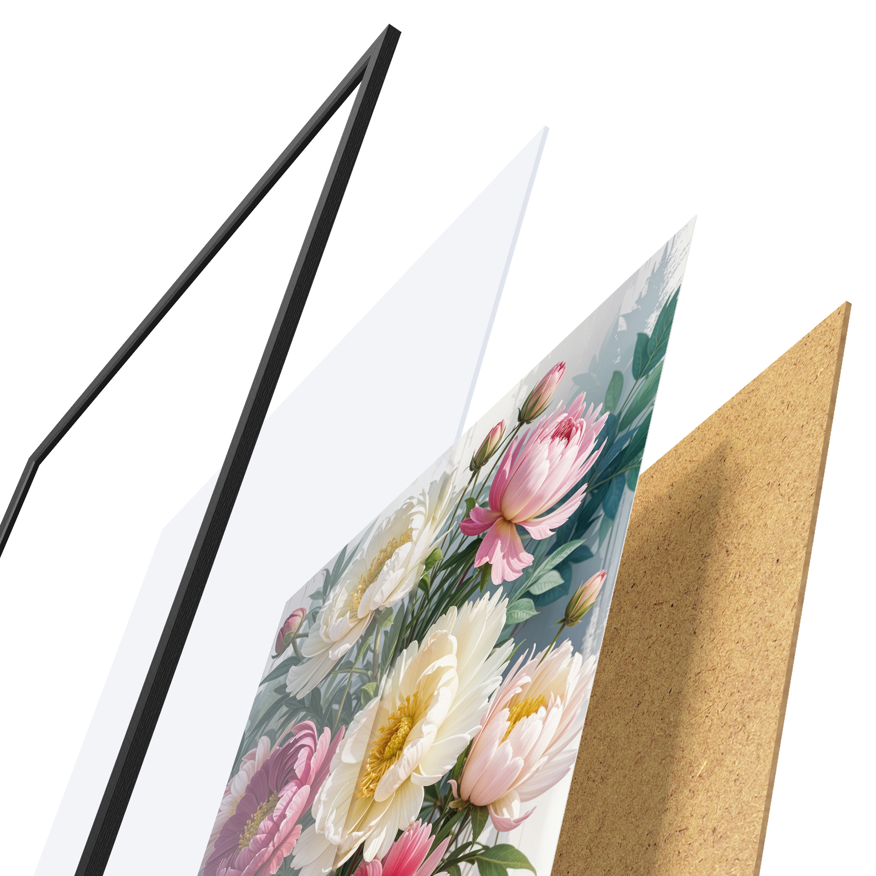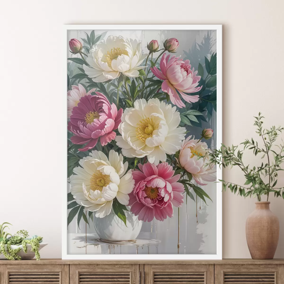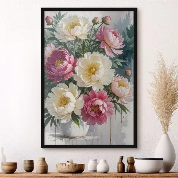 Plakatas Įvairių rožinių, baltų ir geltonų atspalvių su dažų purslais ryškių bijūnų gėlių puokštė f40403
