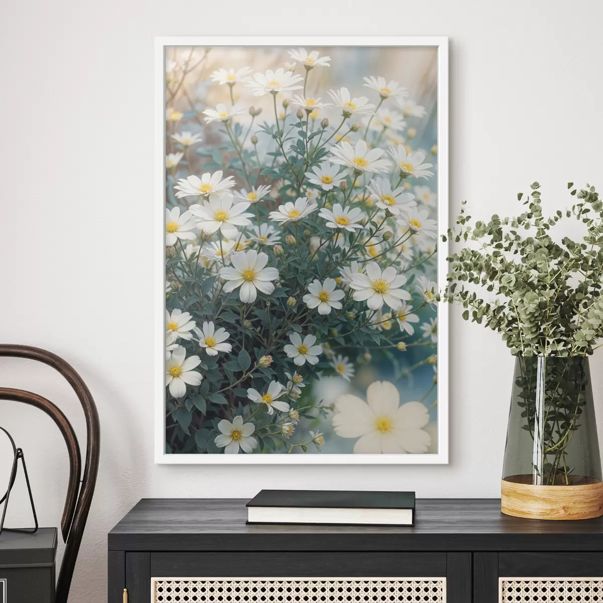Plakatas Baltų ramunėlių žiedų laukas su žalia lapija neryškiame fone f40413